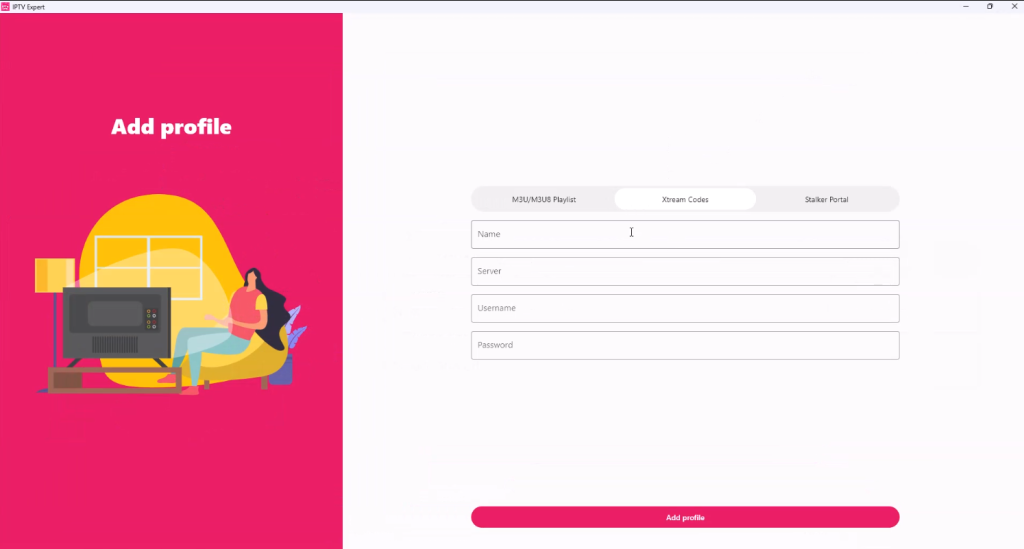 Select ‘Xtream Codes’, which is the middle option in the image below. In the ‘Name’ field, enter ‘svenskiptv.com’. In the ‘Server’ field, enter your Portal URL, which you receive from us with your free trial or purchase. Then press the ‘Add profile’ button.