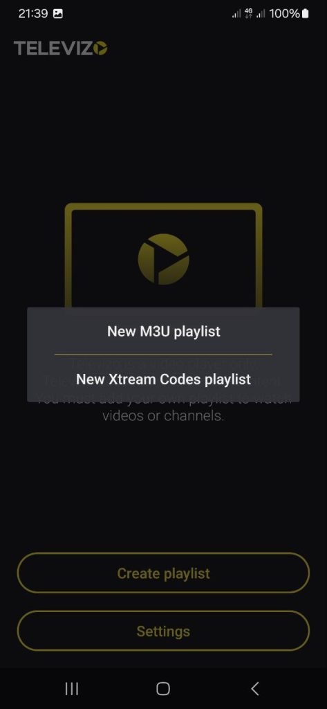 Start the app and tap “Create playlist”. Then select “New Xtream Codes playlist”.