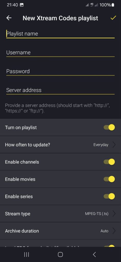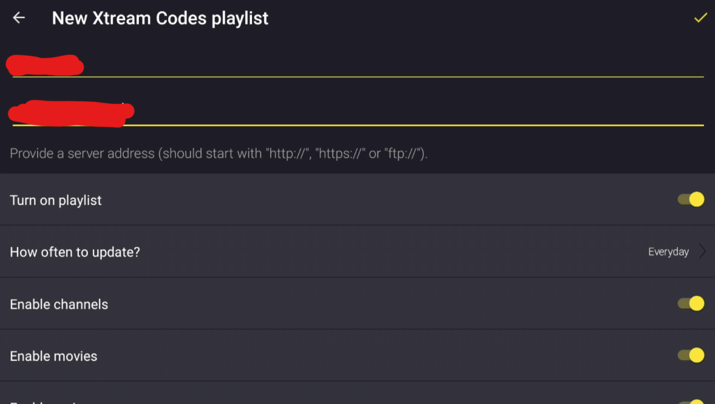 .Then enter the login details you received from us. When you are done, tap the yellow checkmark in the top-right corner. If that does not work, press the back button. When you are prompted to save the playlist, tap “Yes”.